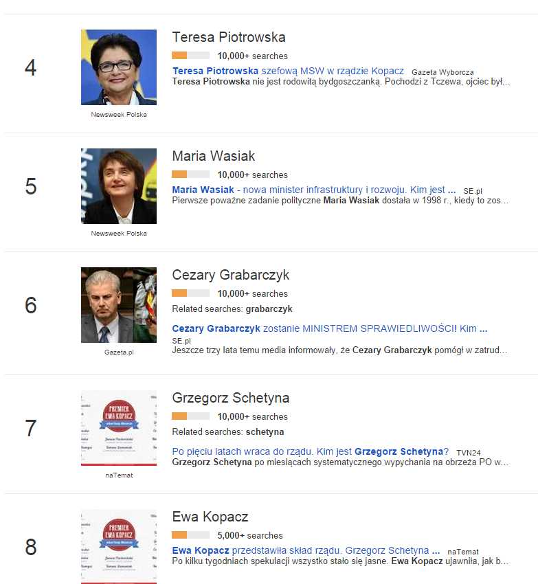 W dzień prezentacji gabinetu najpopularniejsze były hasła powiazane z nowymi ministrami (poza Andrzejem Halickim).