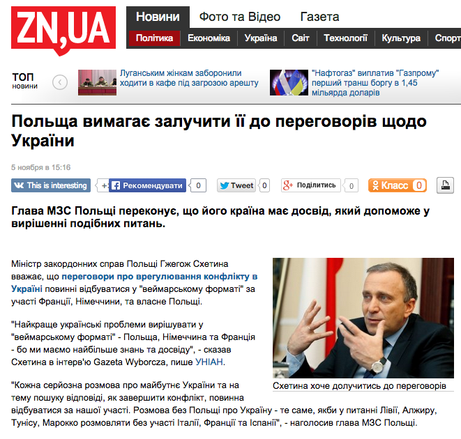 Słowa Schetyny o tym, że Polska powinna uczestniczyć w rozmowach o Ukrainie jak Włochy o Libii, Hiszpania o Maroku, czy Francja o Tunezji znalazła się na większości ukraińskich portali.