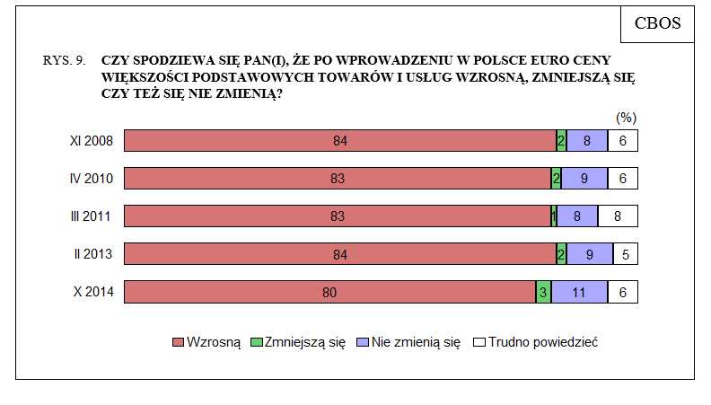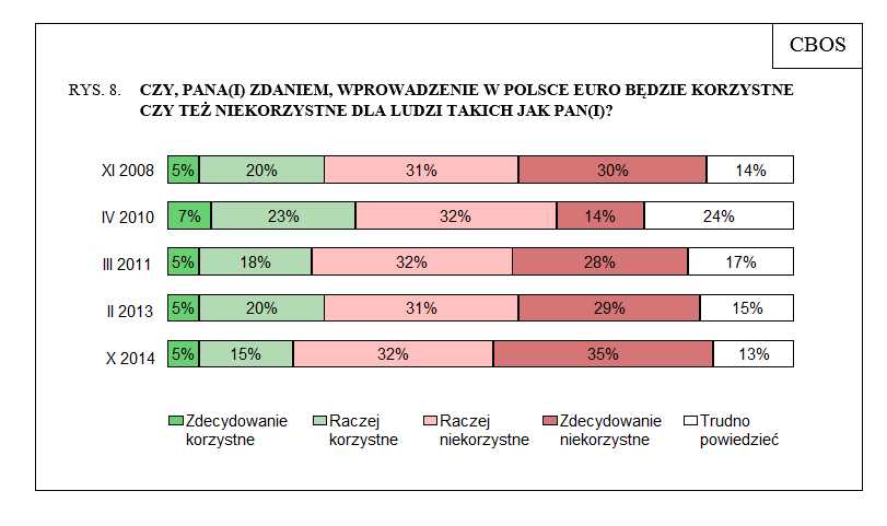 Skutki przyjęcia wspólnej waluty. Rosną także obawy co do rezultatów akcji do eurozony. Jak podkreśla CBOS: "Obecnie wyraźnie więcej osób niż w latach ubiegłych skłonnych jest kwestionować spodziewane pozytywne efekty ekonomiczne wprowadzenia wspólnej waluty. Niemal połowa badanych (49%, o 9 punktów więcej niż w lutym 2013 roku) obawia się, że przyjęcie euro będzie niekorzystne dla polskiej gospodarki. Pozytywnych gospodarczych skutków tego posunięcia oczekuje jedynie 30% badanych (o 6 punktów mniej niż wówczas). Blisko połowa respondentów (46%, o 13 punktów więcej niż w lutym ubiegłego roku) jest zdania, że polscy przedsiębiorcy stracą w wyniku wprowadzenia europejskiej waluty. Korzyści dla przedsiębiorców spodziewa się co trzeci ankietowany (33%, o 7 punktów mniej niż poprzednio).