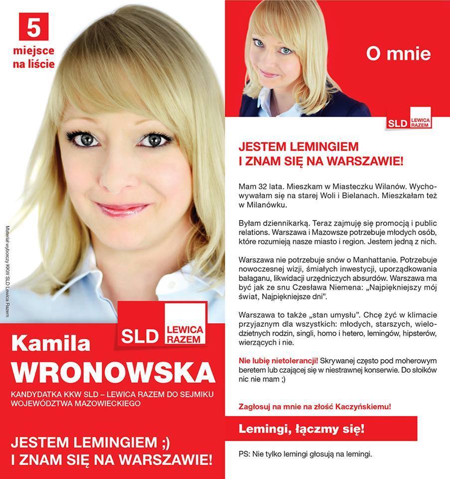 Kamila Wronowska (CM SLD) postawiła w swojej kampanii do sejmiku na apel do lemingów.