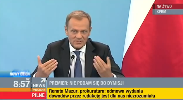 Donald Tusk zwołuje konferencję prasową w kilka godzin po nocnych zdarzeniach w siedzibie redakcji. Mimo że jest dzień wolny od pracy (Boże Ciało), szef rządu pojawia się w KPRM na spotkaniu z dziennikarzami już o 8 rano. Tłumaczy się z interwencji ABW, twierdzi, że jest po słowie z prokuratorem generalnym i ministrem sprawiedliwości. Wygląda jednak na zdezorientowanego, bezradnego; momentami premiera ponoszą emocje, co zwykle na tego typu spotkaniach się mu nie zdarzało. Do jednego z dziennikarzy, który zapytał szefa rządu, czy ten poda się do dymisji, Tusk rzucił: - Pan wygasi trochę. No, emocje. Czy pan jest na konferencji, czy na wiecu politycznym? Symbolem stało się stwierdzenie obecnej na konferencji Moniki Olejnik (już sam fakt jej uczestnictwa na spotkaniu był znaczący), która zwróciła się do premiera: - Całe środowisko dziennikarskie jest przeciwko panu. Ten - zaskoczony - odpowiedział tylko: - Tak, zauważyłem.