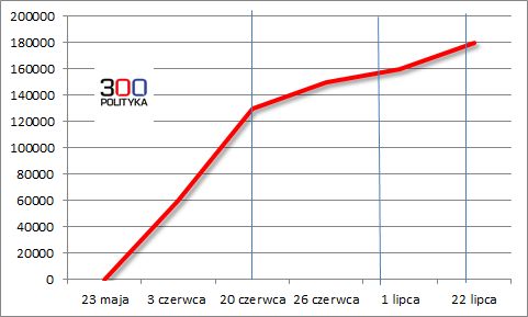 Wykres pokazuje dynamikę zbierania podpisów przez WWS. Punktem startowym jest 3 czerwca, gdy Piotr Guział ogłosił, że jest ich 60 tysięcy. Nie ma mowy gwałtownym wzroście liczby podpisów w ostatnich dniach, w najlepszym razie tempo jest identyczne. Oto wykres na podstawie dostępnych danych wraz z (i tak optymistyczną dla WWS) projekcją.
