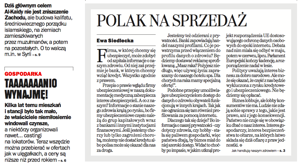 -- POLAK NA SPRZEDAŻ- PISZE NA JEDYNCE GAZETY WYBORCZEJ EWA SIEDLECKA: “Firma, w której chcemy się ubezpieczyć, może zdobyć od szpitala informacje o naszym zdrowiu. Od niej zaś przejmie je bank, w którym chcemy wziąć kredyt. Wszystko zgodnie z prawem. Przepis o prawie wglądu firmy ubezpieczeniowej w naszą dokumentację medyczną zabezpiecza interes ubezpieczycieli. A co z naszym? Informacje o stanie naszego zdrowia krążą po rynku, bo firmy ubezpieczeniowe często należą do grup kapitałowych wraz z bankami i innymi instytucjami finansowymi. Jeśli jesteśmy chorzy lub tylko zagrożeni chorobą, możemy nie dostać kredytu albo polisa może się okazać dla nas za droga.”