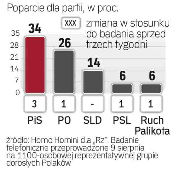 w wyborach. Z sondażu wynika, że na PiS chce głosować 34 proc. ankietowanych, a na PO – 26 proc. Poprzednie badanie Homo Homini zrealizowało 19 lipca. Obie partie dzieliło wtedy