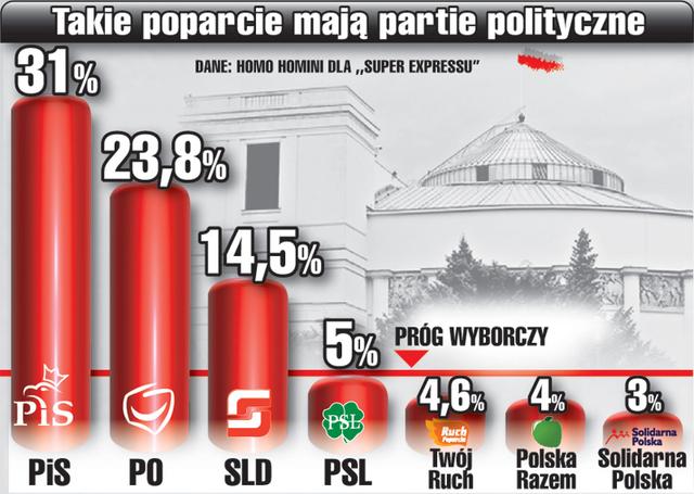 -- HOMO HOMINI DLA SUPER EXPRESSU: PALIKOT I GOWIN POZA SEJMEM? Prawo i Sprawiedliwość - 31,1 proc. Platforma Obywatelska (23,8 proc.) Sojusz Lewicy Demokratycznej - 14,5 proc. Do Sejmu wchodzi jeszcze Polskie Stronnictwo Ludowe - 5 proc. Twój Ruch otrzymuje 4,6 proc. a Polska Razem Gowina 4. Solidarna Polska 3 proc.
